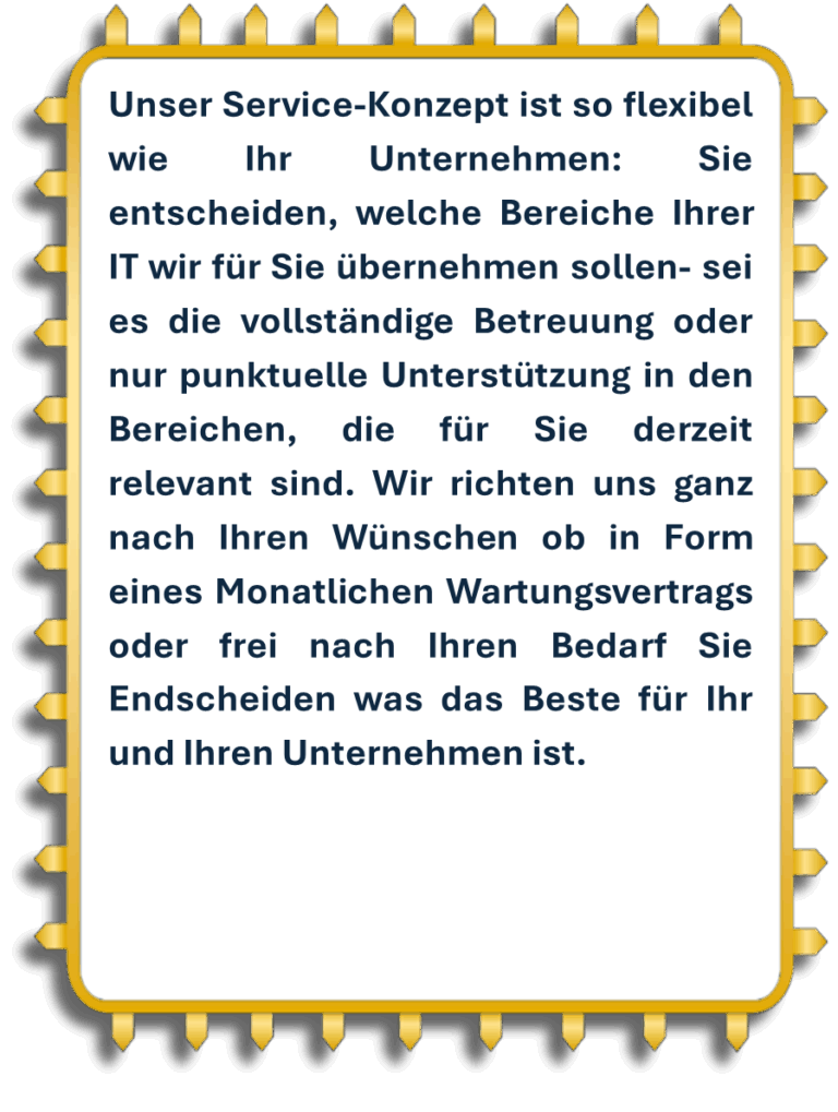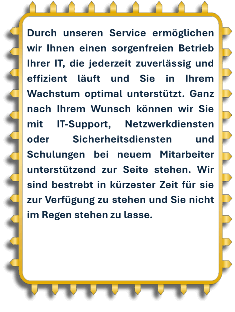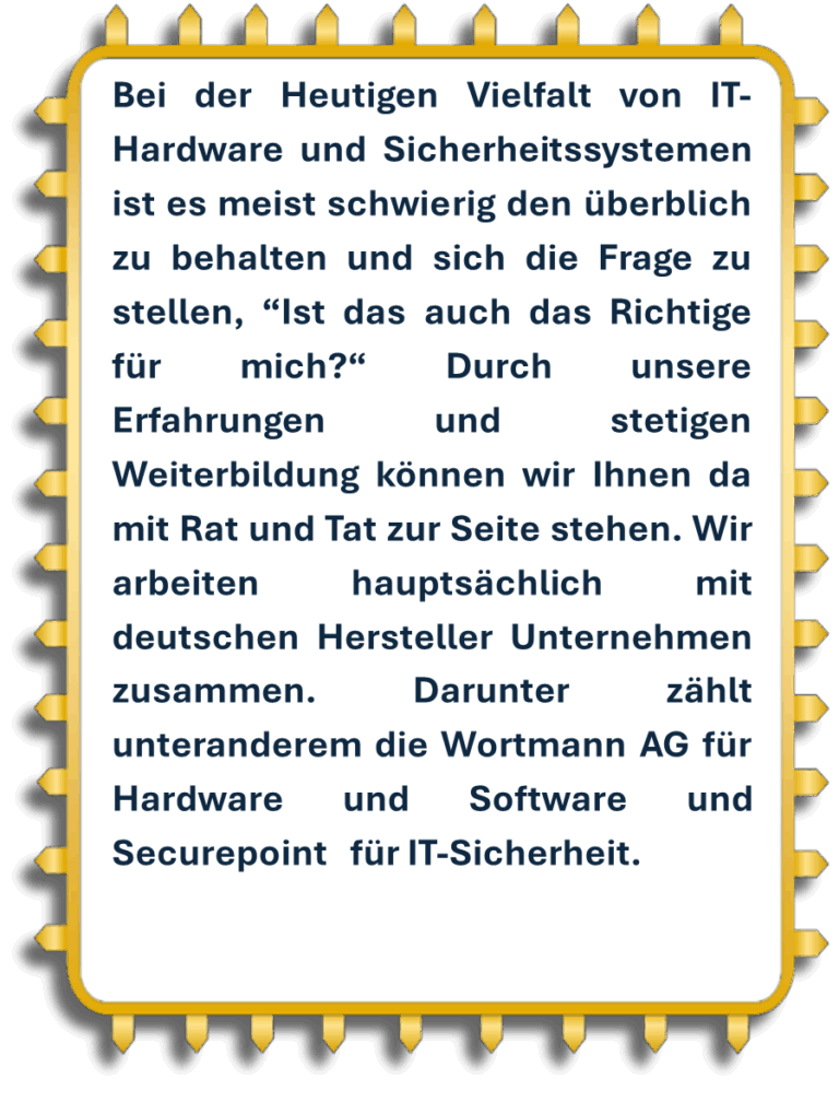 Wir sprechen Ihre Sprache, hören zu, denken mit und handeln vorrausschauend. Statt Warteschleifen und Ausreden erwarten Sie bei uns echte Menschen, die Ihre IT im Griff haben kann -engagiert, erreichbar und lösungsorientiert.